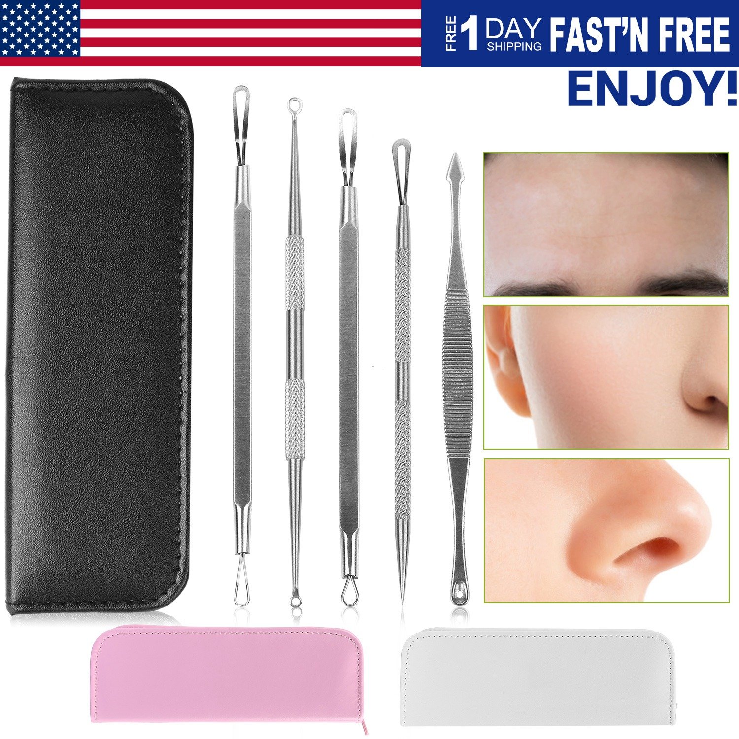 Our 5 Pcs Blackhead Remover Kit adopts 100% medical grade non-allergic stainless steel to clean the embarrassing blemish on your face skin. Each blemish extractor tool is designed with different double-end to fit for your different sized and shaped pimples, blackheads, acne or whiteheads, etc. A good helper to smooth and beautify your nose or face skin. The ergonomic and textured anti-slip handle offers a secure grip and a safe way to control the pressure while using. Moreover, comes with a zippered carrying leather case makes it well-kept and easy to carry while traveling.