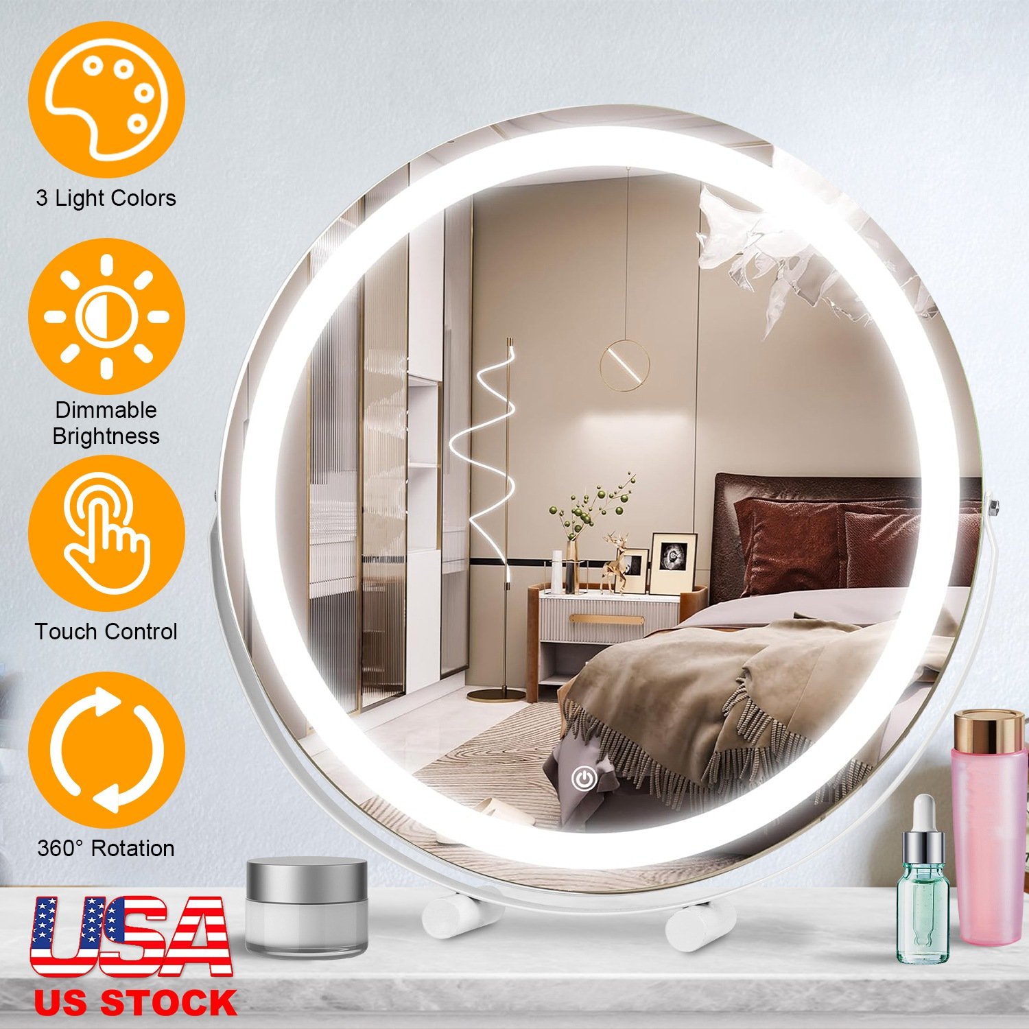 This large round vanity mirror with LED lighting provides a clear reflection of your upper body. Featured with adjustable lighting colors, dimmable brightness, and 360° rotating design, you can customize your desired makeup angle and lighting condition. The high-definition explosion-proof glass ensures safety and clear reflection, while the sturdy iron frame offers durability. Classic white color and elegant shape can perfectly match diverse decoration styles in bedroom vanity, dressing room and bathroom. Perfect gift for your girlfriend, mother or wife.